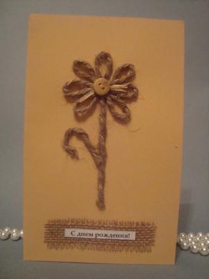 Эту открытку сделать легко и просто! Понадобится: - скоч двусторонний; - ножницы; - веревка строительная; - бумага для акварели бежевая; - пуговица; - надпись "с днем рождения"; - клей.