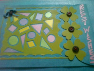 And these flowers as you see on the right side have not been pasted but stitched nicely with a button at the top on them...adjacent to which i have cut out alphabets saying BEST WISHES of a different colour and pasted them on this.