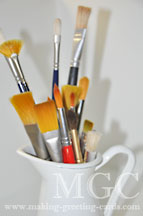 I like to use poster paint when working with children because it is easy to clean up and inexpensive. When I'm making cards myself, I use acrylic paints or water colors. Acrylic paints can cover wide area and can also be used with paste to make interesting textures.