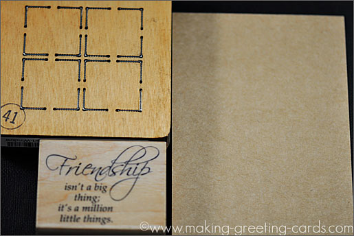 Click on any of the images below to see a gallery of cards on this page. Actually, for this hand painted greeting card, I started off with the 4 pieces of one and a quarter inch kraft squares cut from an AccuCut die. Look at the image below for the 4 squares die I'm referring to as well as the rubber stamp and kraft folded blank card. The wood mounted stamp is by Penny Black. (4176H - friendship) ![]() |