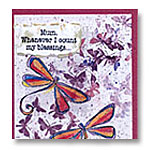 Dragonflies Greetings for MomMaking interesting mothers day cards can be fun. This is a card I made for my mom using dragonfly image rubber stamp and torn paper with computer printed message. The message said,"Mum, whenever I count my blessings, I count you twice." Rubber stamps used are Dragonflies by Magenta Rubber Stamps and Splatter Pattern background by All Night Media Rubber Stamp. |